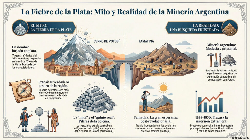 La joven Argentina intentó constituirse como un “país minero”, poniendo sus esperanzas en los supuestos tesoros del cerro Famatina en La Rioja, al que consideraban un digno reemplazante del Potosí perdido. Sin embargo, este primer ciclo de la minería nacional, que buscaba afanosamente oro y plata, se cerró con un fracaso total hacia 1830. Las causas fueron múltiples: la permanente anarquía y los desencuentros políticos, las características geológicas del suelo que no presentaban yacimientos de la magnitud esperada, y la falta de conocimientos técnicos y capital para una explotación moderna.
