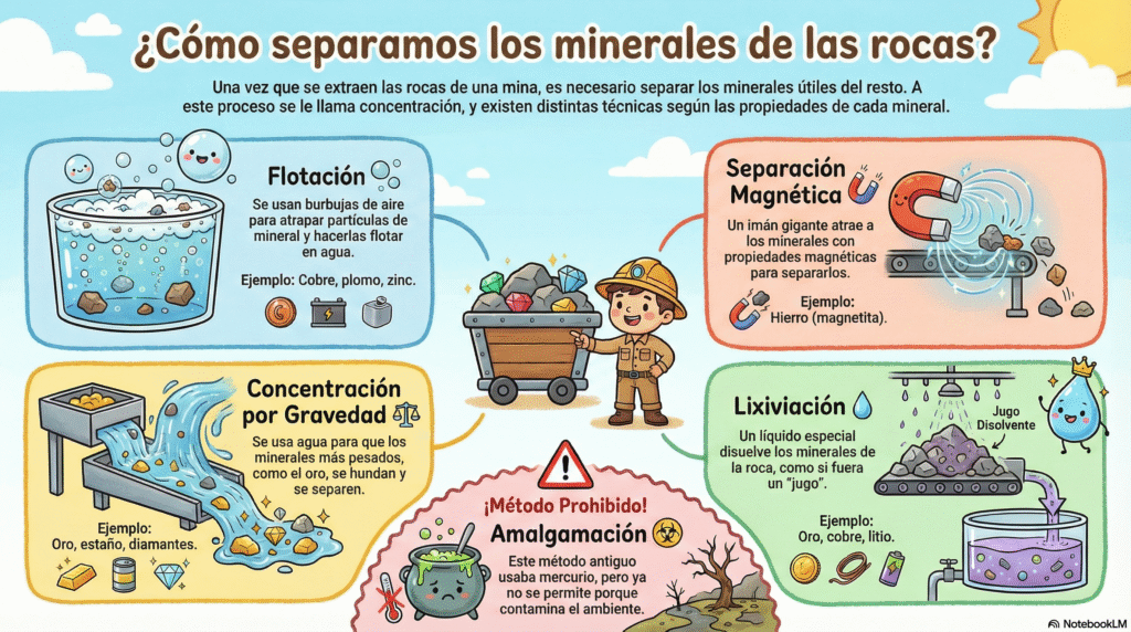 En este caso, el mineral se separa usando una solución líquida especial, que se filtra entre las rocas y disuelve el mineral. Luego, ese líquido se recoge y se procesa para extraer el metal. 💧